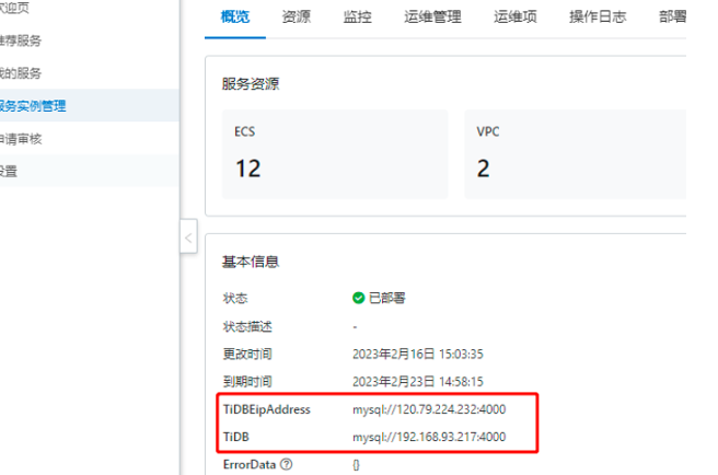 2、外网访问方式:根据外网访问的方式,我们首先要获取其外网的IP,这里在服务的“概览”页面,我们就可以直接获取,从下图中我们可得知我们该TiDB的外网可访问IP为:120.79.224.232