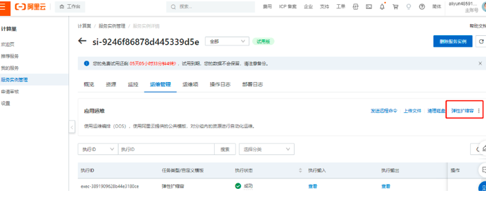 5、在服务管控页面,对于DBA而言,还是比较关注“运维管理”功能的,在这里我们看到可以对服务对应的资源进行“发送远程命令”、“上传文件”、“清理磁盘”、“弹性扩缩容”等相关操作,相关功能均已体验了一下,这时就简单写一下“弹性扩缩容”的功能点: