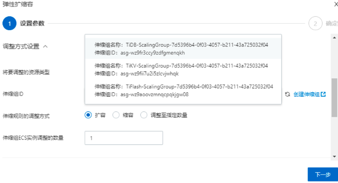 决定对某一组件进行扩缩容后,填写相应的数量,即可点击“下一步“,完成此类操作;该功能点相对简单。
