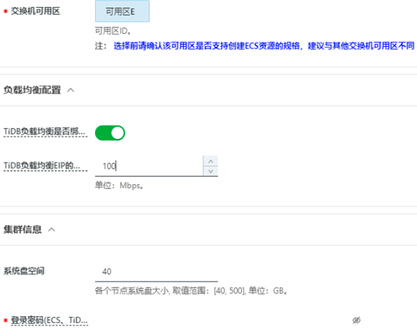 3、交换机可用区按需选择(一定要选择下,否则默认是没有选择的);另外,借鉴体验群里其他同伴们的经验,我这里想要外网访问一下该数据库服务,因此开启了“TiDB负载均衡是否绑定EIP”的功能,由于是试用环境,其他信息均默认: