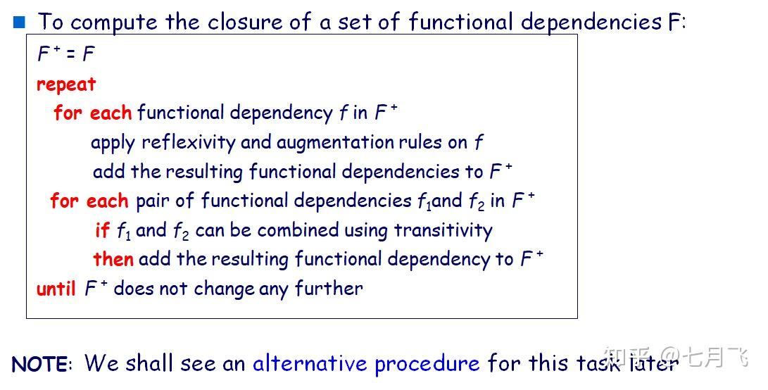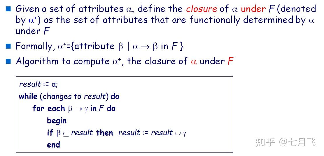 初始化时 F^+=F ,通过不断应用公理的三个规则,经产生的新的函数依赖添加到 F^+ 中,直到 F^+ 中的元素不再变化