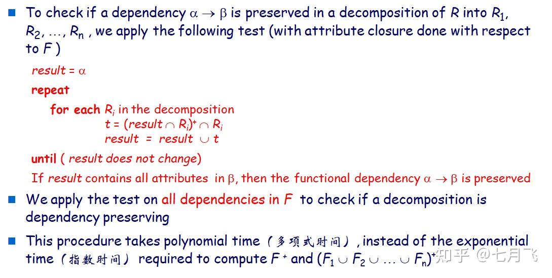- 如果 (F_1\cup F_2 \cup ... \cup F_n)^+ = F^+ ,这个分解是依赖保持的