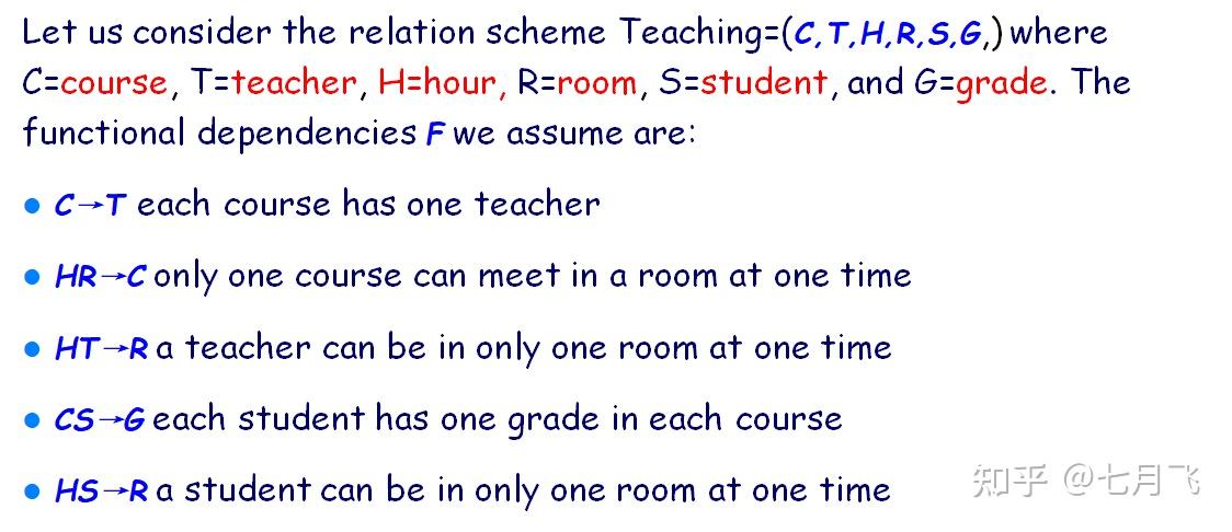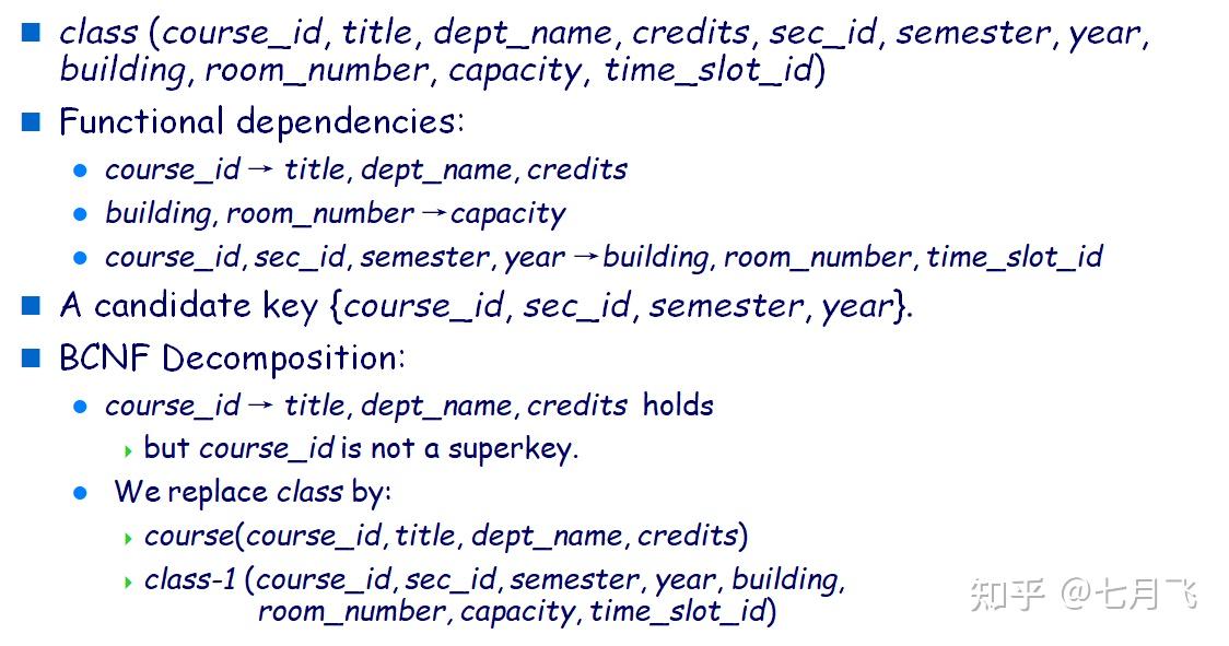 - 关系 R 的模式为 R = (A, B, C) ,函数依赖集合为 F = \{A\rightarrow B,B \rightarrow C\} ,Key = \{A\} 。不符合: B\rightarrow C 中 B 不是super key