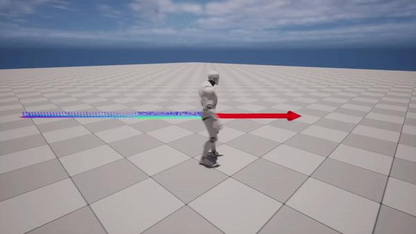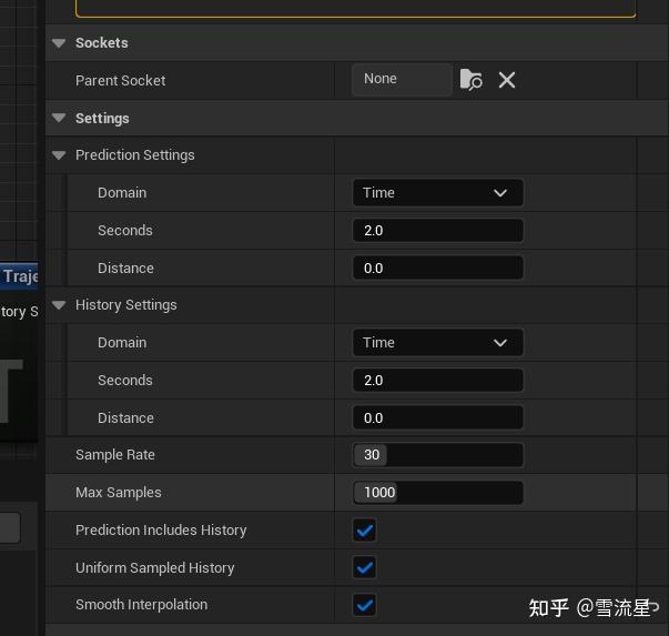 上面提到过最重要的特征数据是Trajectory,Trajectory数据本质记录的是动画根运动数据,包括Root骨骼的Transform,Velocity等,那么他要和谁进行比较呢,自然是游戏中角色的实际移动信息,而角色的移动是Character Movement Component组件决定的,我们需要实时读取角色身上的相关数据与每个Pose的Trajectory数据进行对比计算,那么要如何读取实际移动的信息呢,而且因为Trajectory特征数据需要预测未来的移动状况(通过Domain),在记录角色实际移动的同时也要做到预测,虚幻提供了CharacterMovementTrajectory组件帮助完成此项任务,组件参数如下: