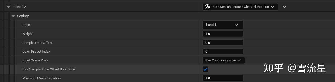 - 还有隐藏的一点,仔细观察我们会发现Sequence End Interval默认值是0.3,上面说过他的作用是裁掉所有动画结尾0.3秒内的Pose,为了不想在Search时选中一个Sequence快要结束的Pose,同时还有另一个大作用,就是使用裁掉的这部分当作特征数据,这样就不需要进行预测了,只对第三种情况会有好很多,毕竟预测的数据不准确,而对于前两种状况则无需考虑。从默认值是0.3也可以看出,官方希望我们Offset最大设置为0.3秒内,不过Time的Offset最大值最好设置为CharacterMovementComponent中角色从最大速度到0的加速时长。