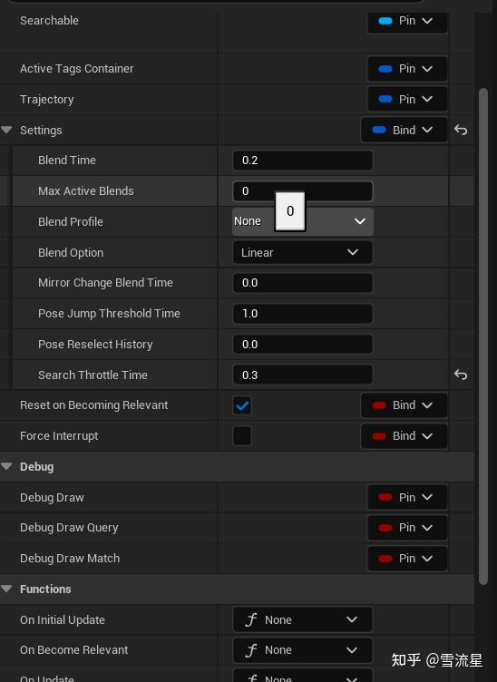 - Blend Time,Max Active Blends,Blend Profile,Blend Option,当进行Search后选择的Pose不是ContinuePose,就需要混合,这些参数用于Pose混合。