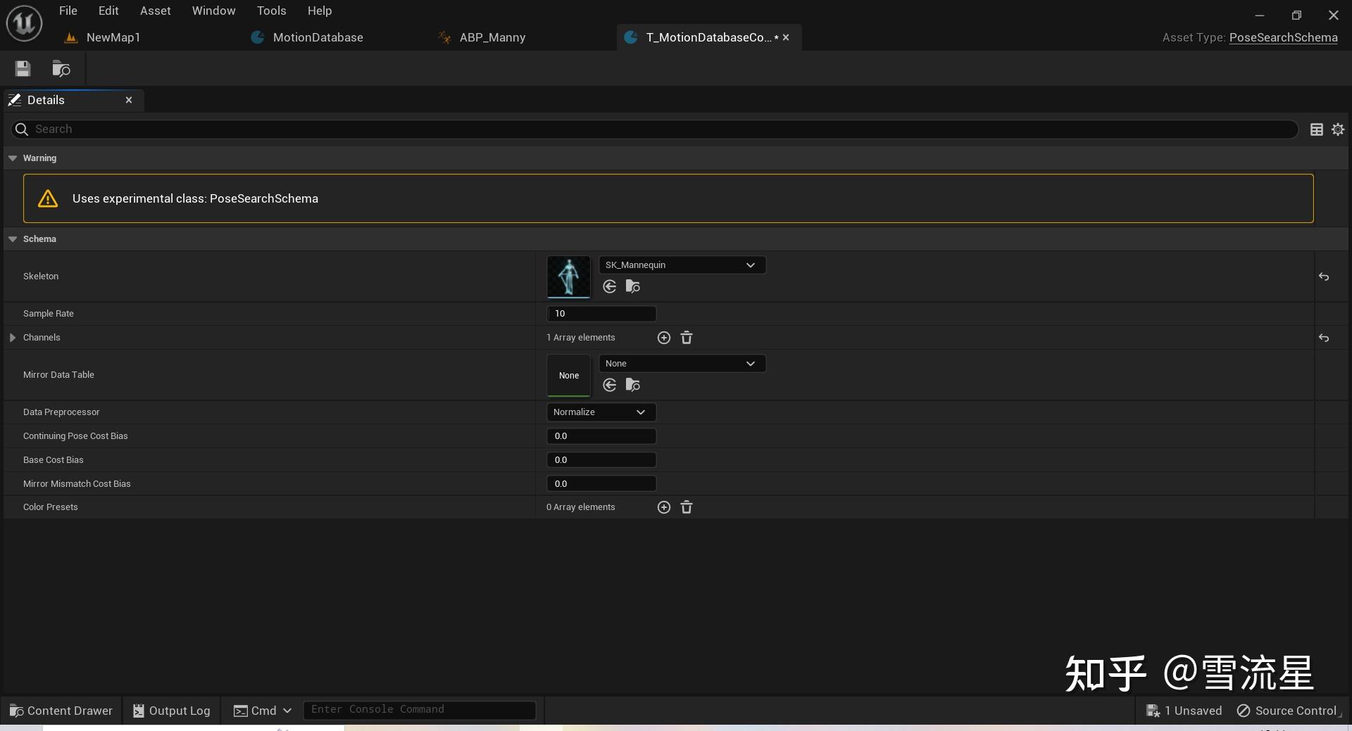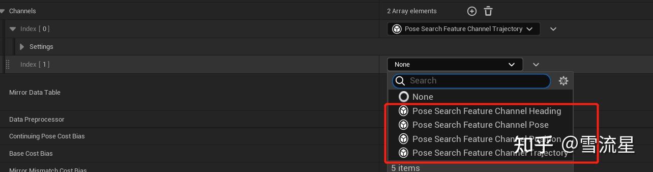 黄色部分显示选中的Pose信息,最上面的Channel BreakDown可以展开每一项特征数据的Cost,ContinuingPose是衔接动画Pose的Cost,大部分情况我们都希望使用这一项,所以列在上面;Bias是我们手动设置的Cost叠加数据,可以全局更改,也可以分动画更改;