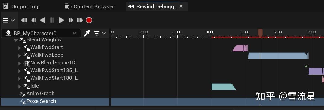 可以使用Trace.Stats查看是否有PoseSearch了,有了之后,RemindDebugger才能记录MotionMatching,可以看到PoseSearch轨道,我们在输入移动可以看到他具体使用了哪些Pose,什么时候执行了Search,以及PoseCost和叠加权重,在Remind Debugger Detail可以查看: