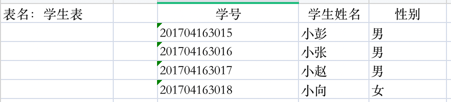 表的每一行记录着数据,这里每一行是一名学生的信息,比如第2行是学号3016学生的信息,他的姓名是小张,性别男。