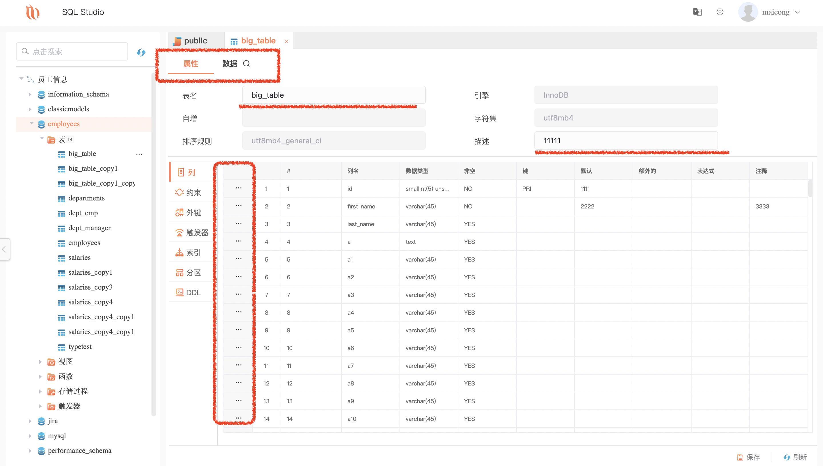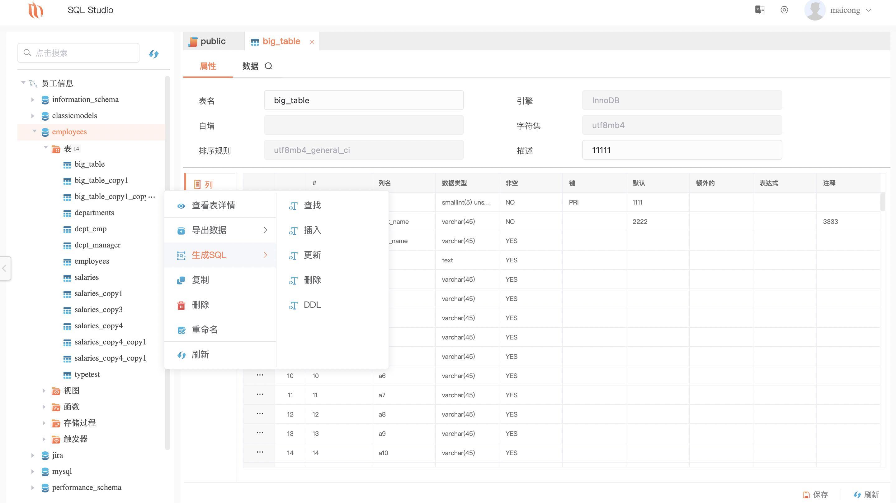 可直接图形化界面修改表属性、表数据,并且能实时看到相应操作背后的SQL语句。