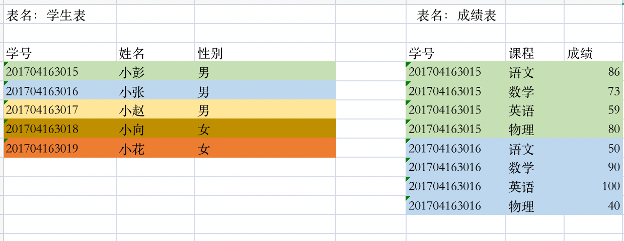 关联,为了更清楚的看到这两个表的关系,我用相同颜色代表同一个学生的信息。