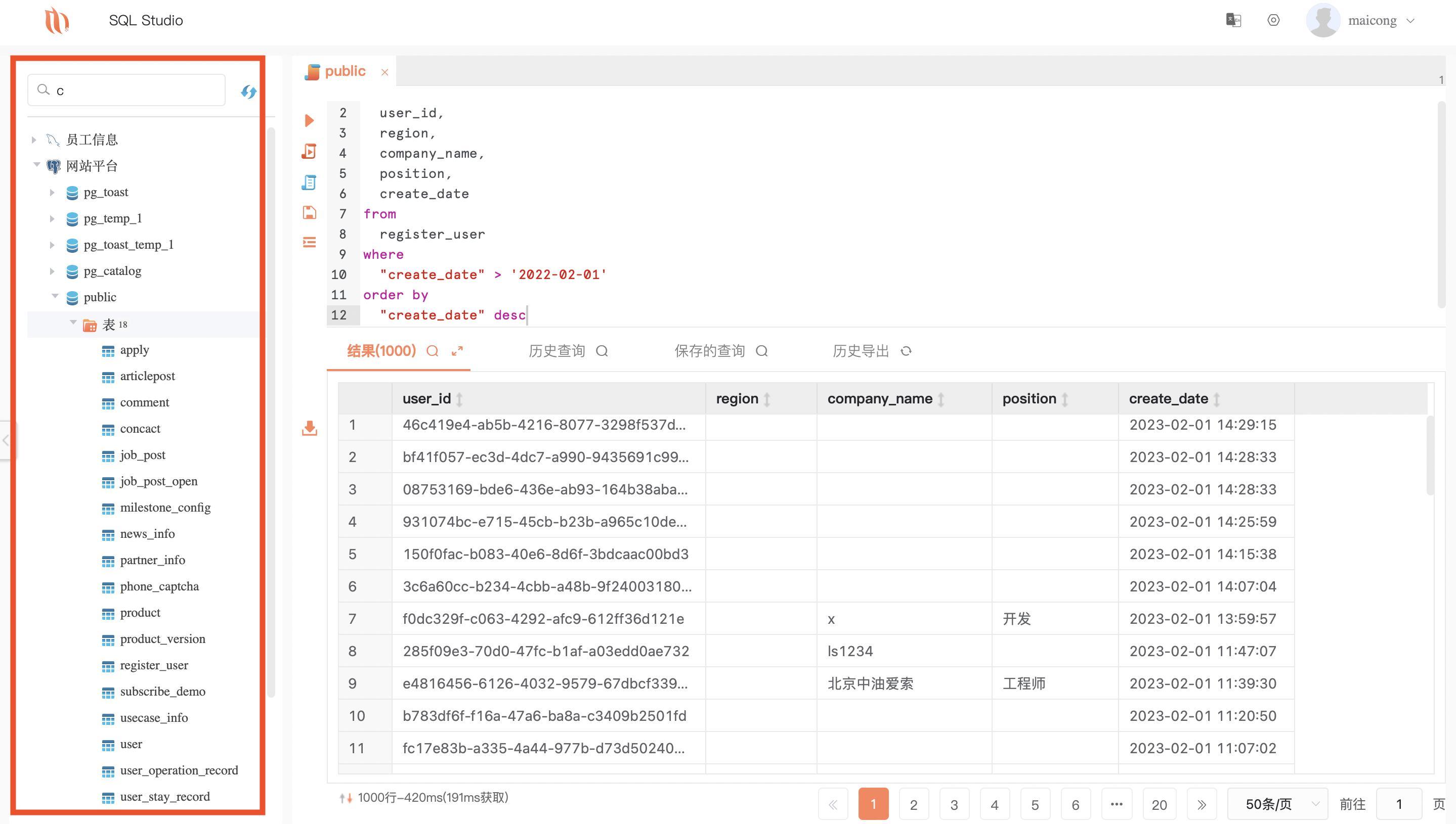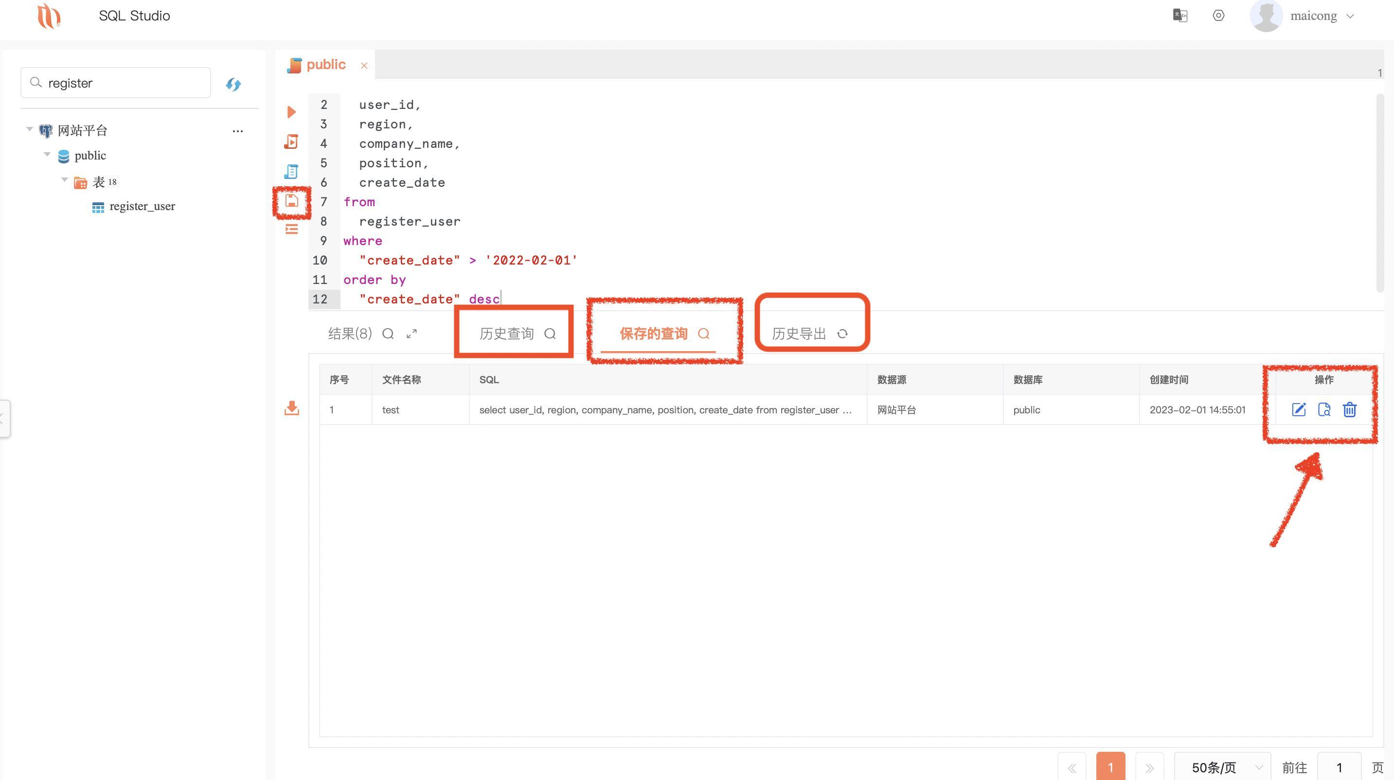 数据库管理工具都会有SQL语句编辑框,“历史查询”会展示所有执行记录;“历史导出”会记录所有的数据导出记录。