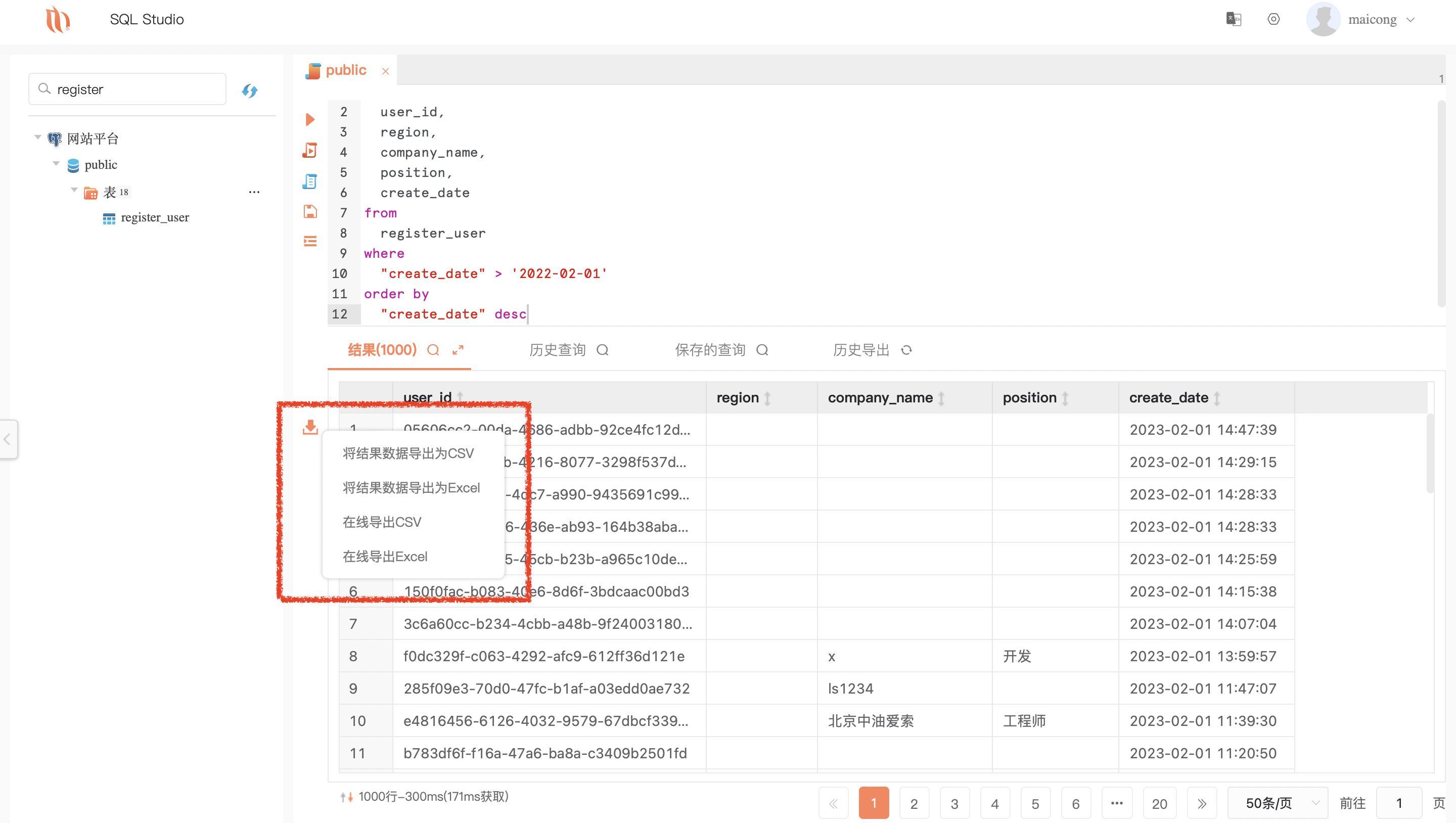 导出数据:可以选择CSV和Excel两种格式;还可以选择导出所有数据或者结果栏显示数据;无线数据量导出,SQL Studio性能稳定不崩溃。