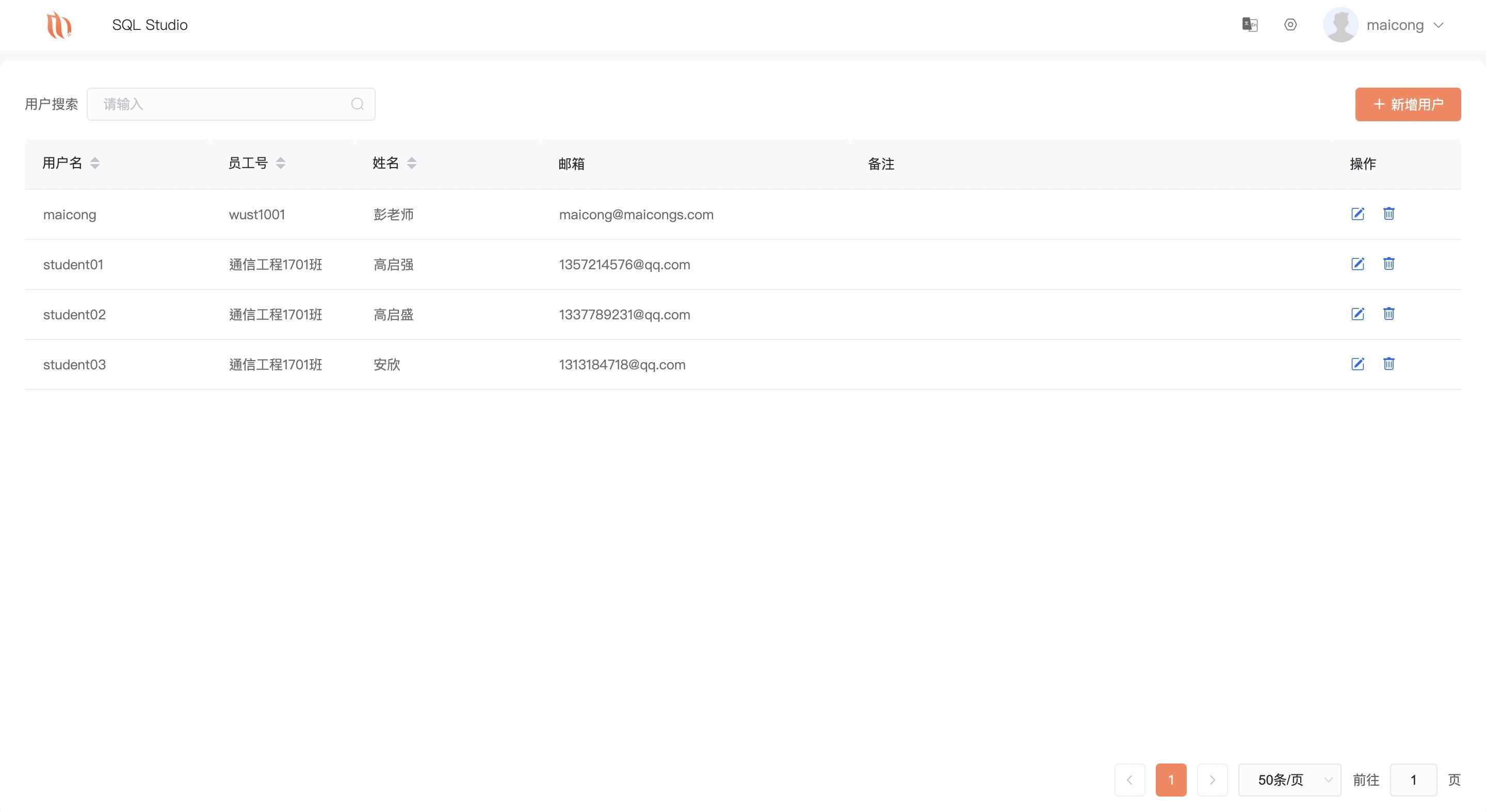 SQL Studio还提供用户管理功能,管理员可以新建普通账号给他人使用,而且只有管理员才能添加、删除数据库;这样就方便公司、学校等场所的集中管理和安全。