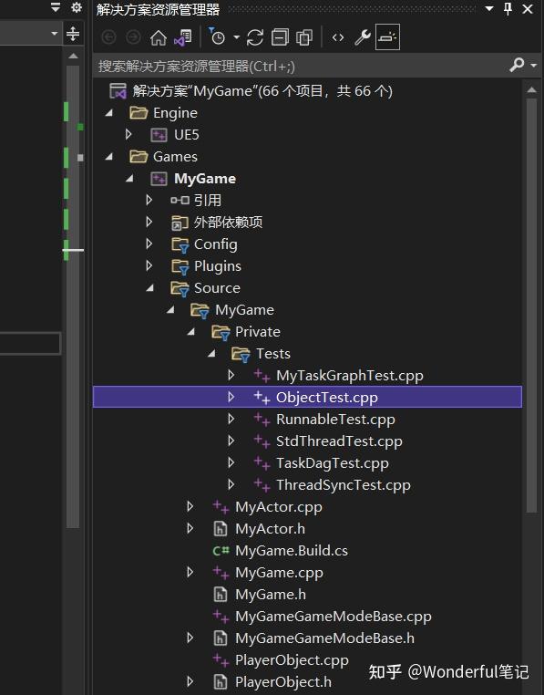 首先我们在项目目录的Source/MyGame/Private/Tests/ 文件夹创建了一个空的ObjectTest.cpp文件,并右击MyGame.uproject,重新生成了项目文件MyGame.sln,然后用Visual Studio打开项目,如下图: