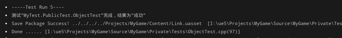 然后我们我们编译运行,并在UE5编辑器打开“工具”--> “会话前端”,并在“会话前端”界面选择“自动化”Tab按钮,然后勾上MyTest/PublicTest里面的ObjectTest,并点击“开始测试”。