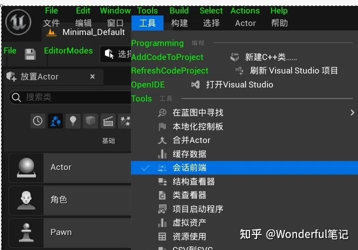 然后我们编译运行,并在UE5编辑器打开“工具”--> “会话前端”: