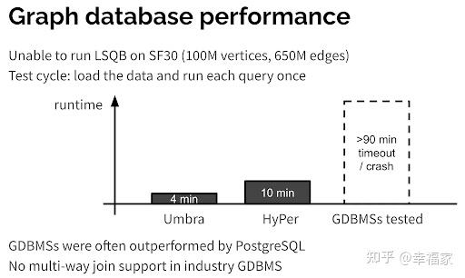 因为关系型数据库经过多年优化,确实已经武装到了牙齿。比如 Peter Boncz 教授(LDBC 创始人之一)在今年早些时候在 EDBT / ICDT 会议上做了个主题演讲——《The (Sorry) State of Graph Database Systems 》,提出当前 GDBMS 跟 RDBMS 相比,在计算和存储层都还有很多地方需要提高,尤其是针对子图匹配(subgraph matching) 这样的 AP 查询。他提出了针对子图匹配场景的性能基准测试(Benchmark)。在他的实验环境下,没有一款图数据库软件在「子图匹配」场景上的性能能够接近 Hyper 和 Umbra 这两款关系型数据库(见下面图1)。