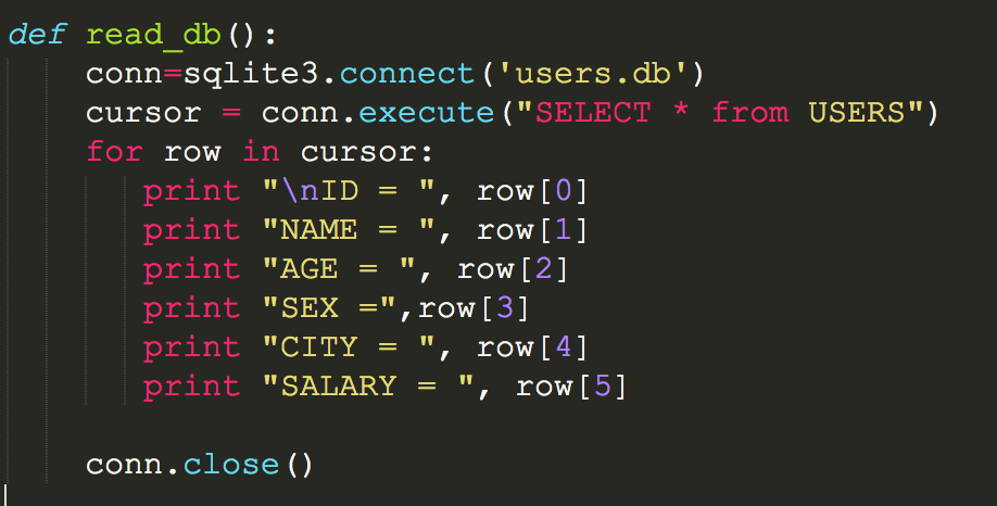 SQLite 的 SELECT 语句,可以方便从 SQLite 数据库表中获取数据,以结果表的形式返回数据。这些结果表也被称为结果集,然后我们打印出这个结果集里面的每一行数据.