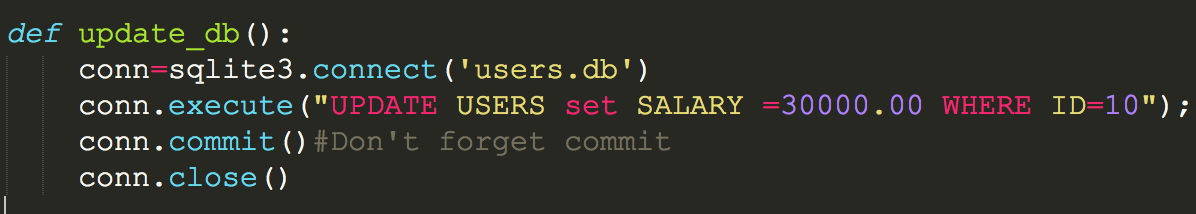 conn.execute("UPDATE USERS set SALARY =30000.00 WHERE ID=10");