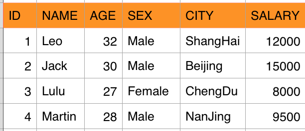 INSERT INTO USERS (ID,NAME,AGE,SEX,CITY,SALARY) VALUES(1,'Leo',32,'Male','ShangHai',12000)