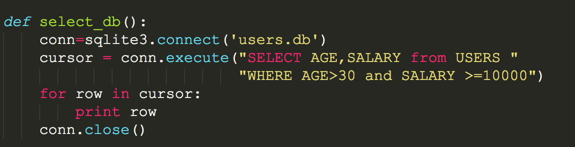 cursor = conn.execute("SELECT AGE,SALARY from USERS "
