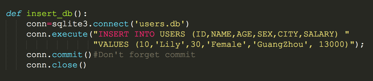conn.execute("INSERT INTO USERS (ID,NAME,AGE,SEX,CITY,SALARY) VALUES (10,'Lily',30,'Female','GuangZhou', 13000)");