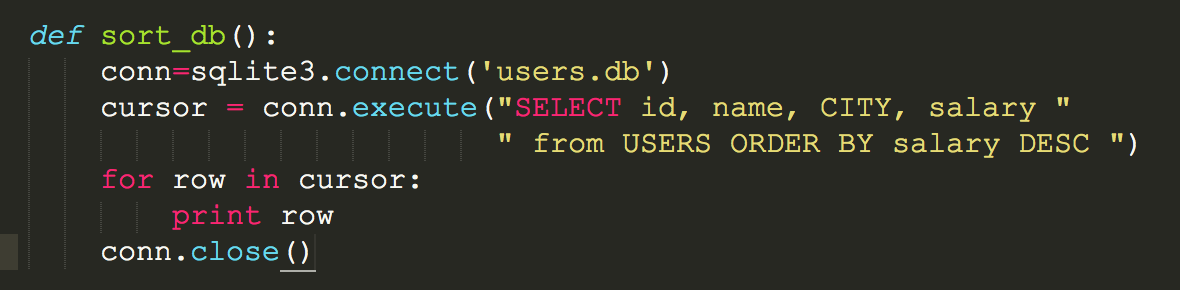 conn.execute("SELECT id, name, CITY, salary from USERS ORDER BY salary DESC ")