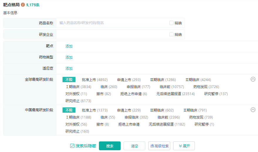 为此,药融云数据库重磅上线【靶点格局数据库】归纳整理了全球各靶点药物的信息,方便大家更快速直观地了解到全球靶点药物研发格局。包括全球同靶点新药研发信息、适应症和企业在各研发阶段的药物数量、以及国内同靶点药物和企业在各申报进度的数量。