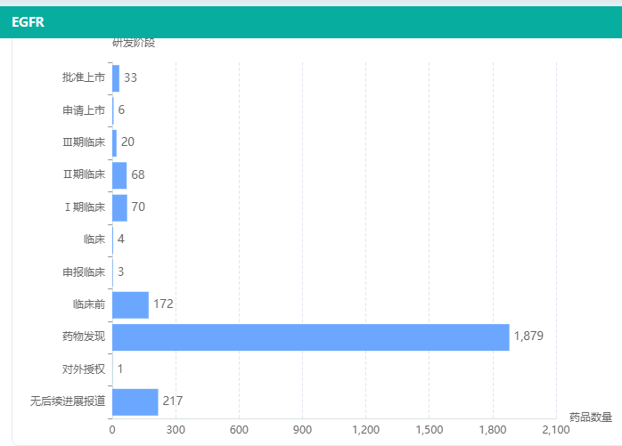 靶点格局数据库整合了全球药物研发数据库中相关靶点的药物信息,通过柱状图可以看到,全球范围内,有33款EGFR靶向药物获批上市,并有6款已递交上市申请。通过饼图可知,EGFR为新药研发的热门靶点,绝大多数(近9成)药物的研发处于活跃状态,其中超7成处于药物发现状态,尚待发力。