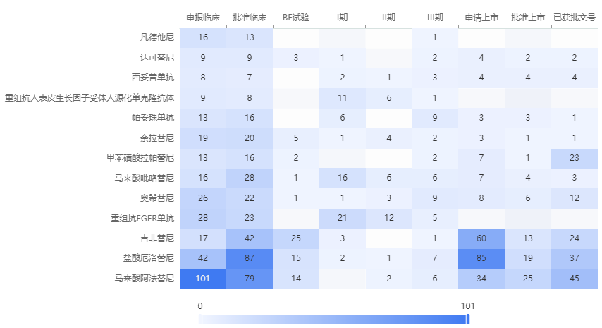 通过【靶点格局数据库】中的适应症研发进程热力图,可以看到,在具体的癌种中,非小细胞肺癌/转移性非小细胞肺癌是研发最为集中的适应症,也是相关EGFR靶向药物获批上市最多的适应症。其次,乳腺癌、转移性直肠癌、头颈部肿瘤等也有数款EGFR靶向药物获批上市。