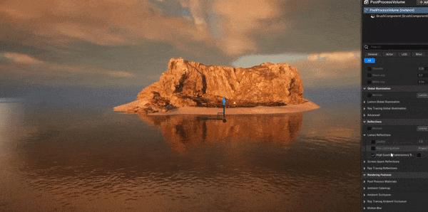 △开启透明材质的Lumen效果,水面像是被“激活”了