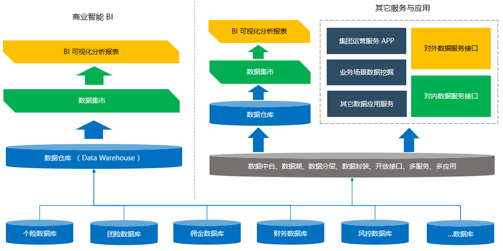 而数据仓库就不一样了,它不是服务于业务信息化系统的,它是服务于分析型应用的。更多的是通过各种商业智能BI前端可视化分析工具或者报表工具来访问数据仓库,最终是面向报表查询,数据分析服务,为业务人员提供复盘、预测,为企业管理人员提供决策信息的。