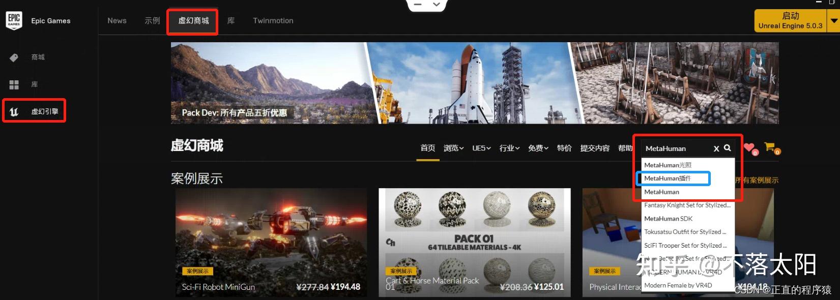 1.打开Epic 平台并完成账号登录,点击虚幻商城搜索MetaHuman(注意是选择MetaHuman 插件 而非MetaHuman项目样例);