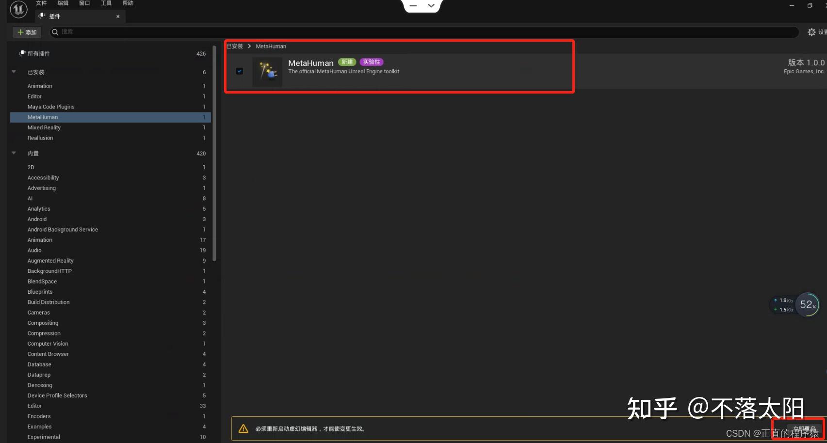 1. 完成上述插件安装后启动UE5引擎,打开或新建一个项目进入插件管理勾选MetaHuman插件,按提示完成重启;
