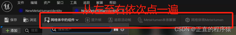 5.选择前置导入的头模网格体->赋予一个UE5的body->提升帧->追踪活动帧->MetaHuman本体解算->网格体转MetaHuman(这里比较好理解按照编辑头部导航栏依次点击操作即可);