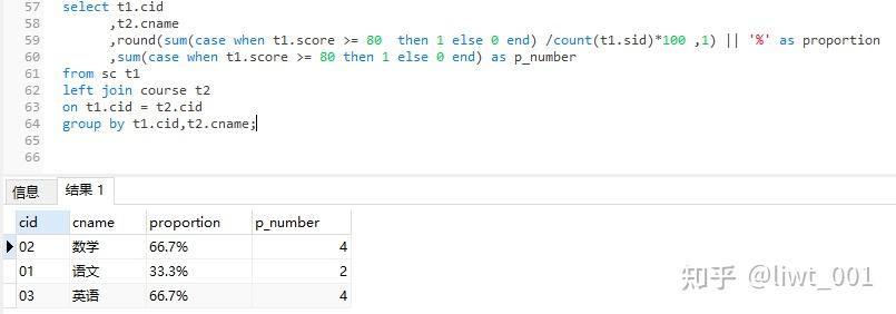 1、统计各科成绩>=70 de 人数:课程编号,课程名称, 人数及所占百分比 5