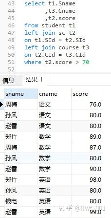 13、查询任何一门课程成绩在 70 分以上的姓名、课程名称和分数 10