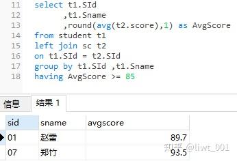 10、查询平均成绩大于等于 85 的所有学生的学号、姓名和平均成绩 8