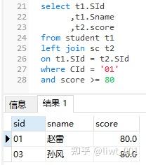 15、查询课程编号为 01 且课程成绩在 80(含80) 分以上的学生的学号和姓名