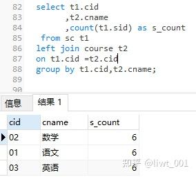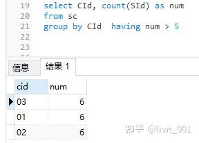 20、统计每门课程的学生选修人数(超过 5 人的课程才统计) 13