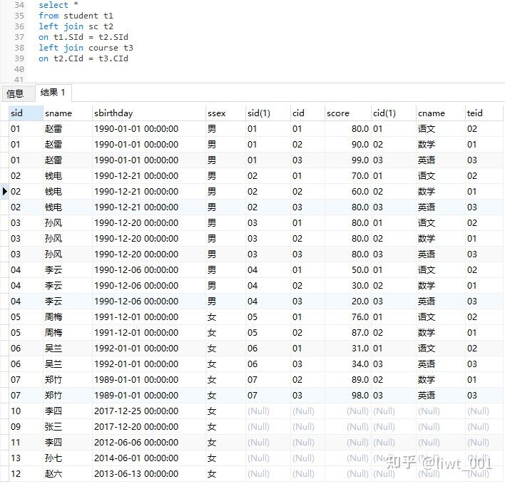 12、查询所有学生的课程及分数情况(存在学生没成绩,没选课的情况) 9