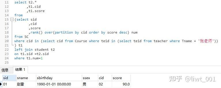 17、查询选修「张老师」所授课程的学生中,成绩最高的学生信息及其成绩 11