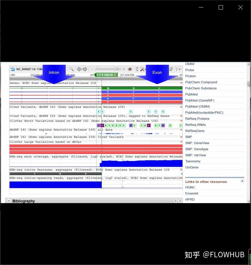 经实验验证的转录本以N 开头,而以X 开头的变体代表预测的mRNA转录本或转录的蛋白质。现在让我们跳到基因上的特定位置117610510,并放大。请注意,较大的条代表外显子,较小的条代表内含子。当基因的变异具有临床意义时,研究人员的一个重要概念是临床变异。颜色越深,变异越致病或致命。请注意,这个特殊的变体rs1800111有一个与之关联的PubMed 引用。浏览器中的附加信息包括基因序列:SNP,单核苷酸多态性,或个体之间的差异;以及关于外显子和内含子的信息;所有这些都带有相关数据库的链接。