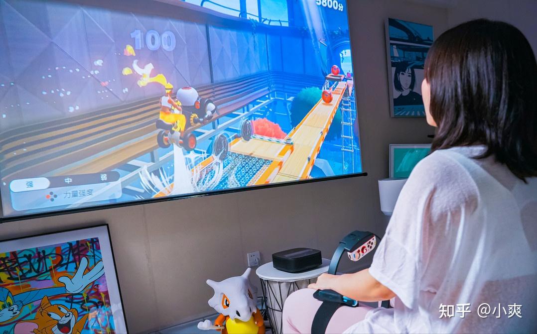 去年健身环大火的时候,小爽就早早就买了健身环。结果由于场地的限制拿出来玩的时间寥寥可数。健身环一定要大屏玩耍才开心。因为在运动的时候难免蹦蹦跳跳,面对SWITCH的小屏幕基本没有办法看清楚上面的提示和游戏画面。外接在显示器上面画面又非常的小。外接在普通的长焦家用投影仪上面又会产生新的问题,那就是人站在投影前会产生很大的阴影。不过有了超短焦激光投影仪之后就没有这个烦恼了。