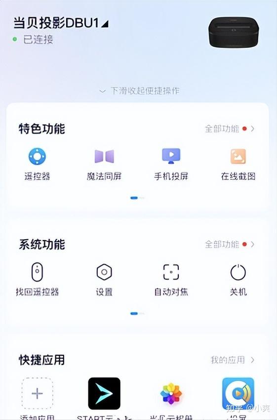 随机器自带了投影仪遥控器,用来操控投影仪。金属材质的遥控器将质感拉满,握在手上操作时,手感非常好。值得一提的是,通过遥控器侧边红色魔法键,可以快速唤醒快捷中心,看剧过程无需退出即可操作。遥控器自带找回功能,在APP上可以一键找回。再也不用担心我这个小马虎弄丢遥控器了。