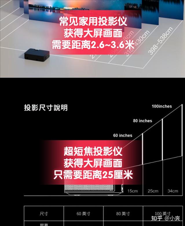 目前比较常见的家用投影仪想要获得大屏画面,投影仪和墙面的距离基本上要在2.6~3.6米左右。如果低于这个距离,就没办法获得这样大尺寸的画面。然而超短焦激光投影仪就打破了这样的距离限制。