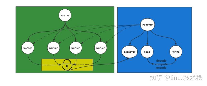 每个进程都有reactor对象。nginx使用的是多进程的Reactor模型。同时,nginx使用ET模式,因为nginx是做反向代理,做转发数据工作的,不需要界定数据包。