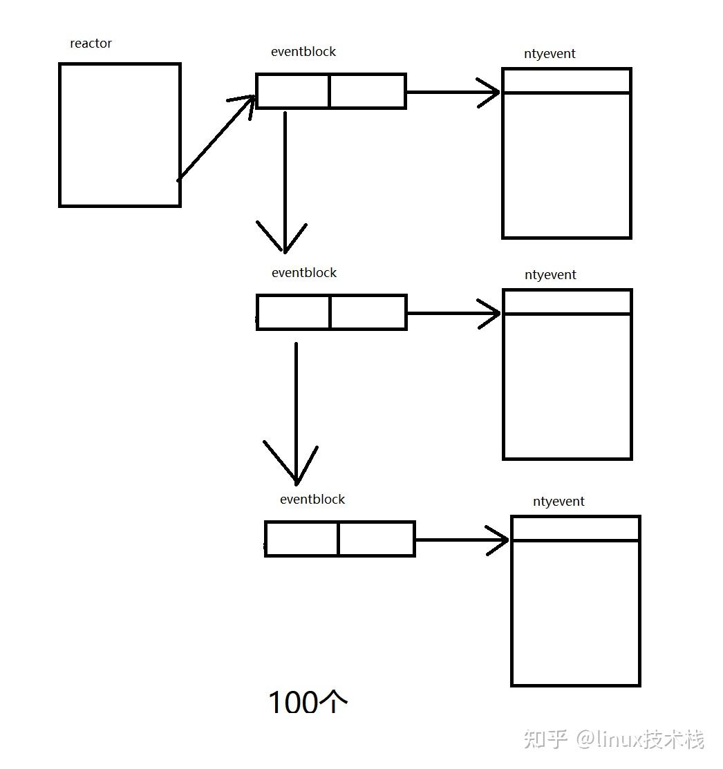 这是百万并发的reactor模型,reactor结构体中eventblock指针指向eventblock链表的头结点,eventblock结构体有指向下一一个eventblock的next指针,也有指向ntyevent头节点的指针