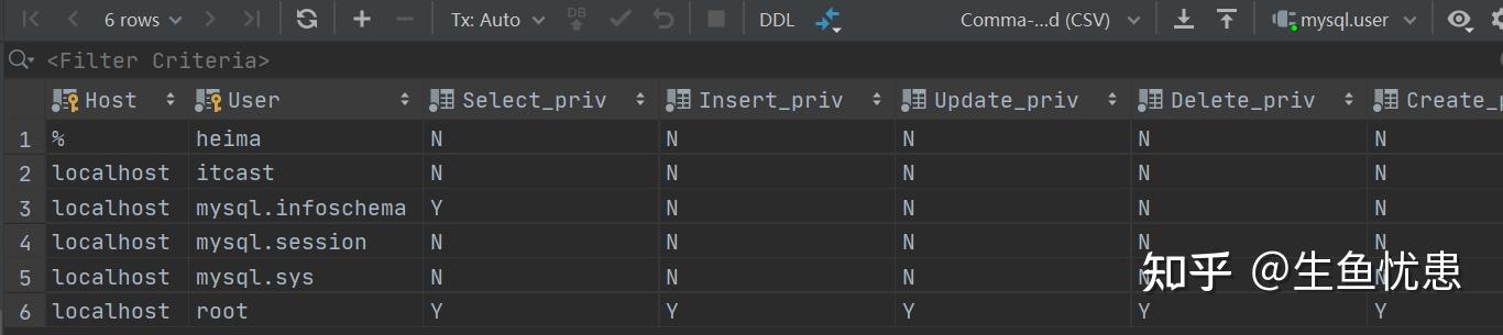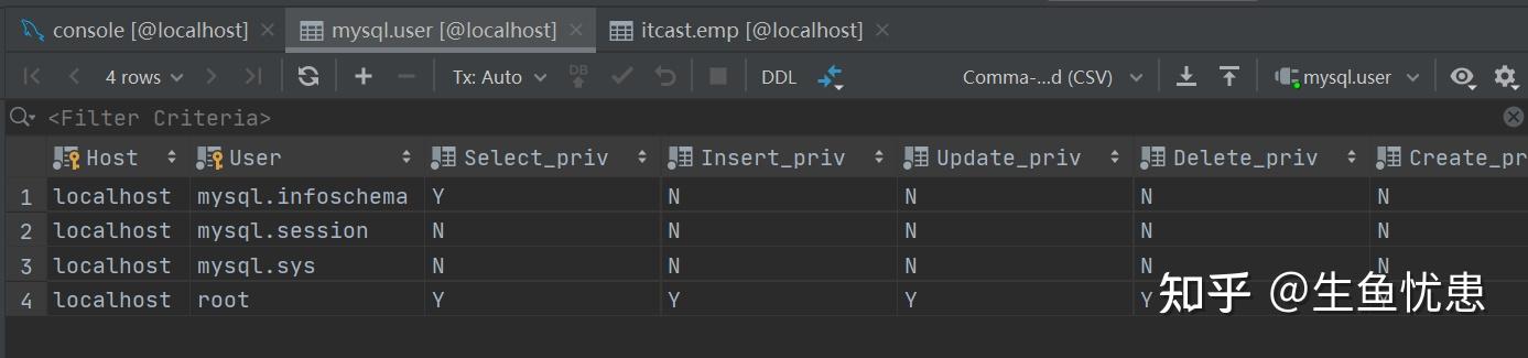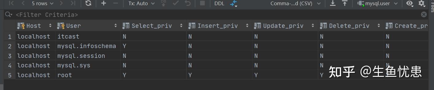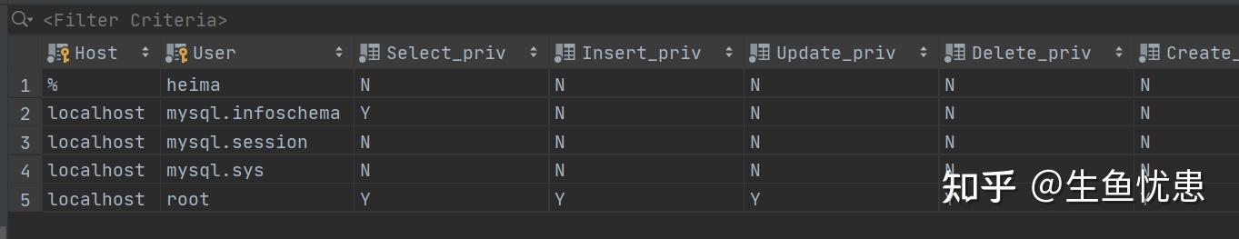 查看本机MySQL的用户和用户权限,直接找见系统mysql数据库的user表mysql.user: